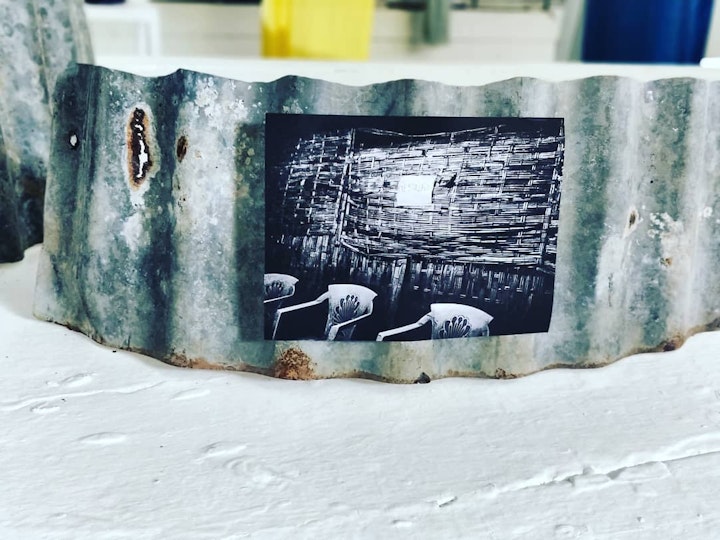 The photos are displayed as snapshots, small photographs hung on scrap metal that could evoke a fragment of space shuttle, or the metal roofing of a city dwelling, or the curvature of space/time itself. The chair and helmet provide a viewing point where viewers can sit and take in these photos, imagining they are traveling in orbit between two planets - that of the past and that of the present.